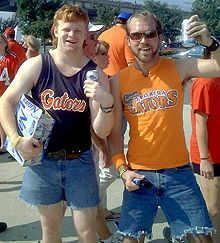 Seriously, you're kidding yourself if you think these guys are just some Wal Mart stock boys who love Florida football. No, these guys are probably mayors of prominent towns in the panhandle. Hell, I'm almost quite certain the one on the left is Jeb Bush*. And you can essentially multiply this picture times 10,000 and mix in some Affliction tees, then imagine them all throwing constant pickup lines at Samantha Steele for 4 hours. The gang will definitely pick Florida, probably via Lee Corso riding a live gator out into the crowd Joe Dirt style.
